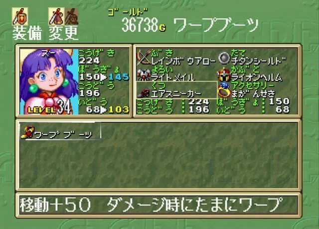 ワープブーツというアイテムでした。 ダメージ時にワープということは連続攻撃とかされたときに有効なのかな? とりあえず移動力が低いスーに装備させました。 (弓矢で攻撃だから移動力が低くてもあまり問題ないのですが)